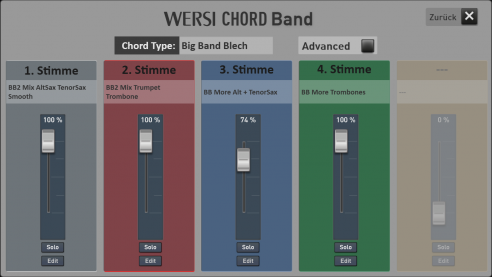 Ab sofort wird die WERSI-Chord-Klangfarbe nicht einfach nur vervielfältigt, sondern sie kann aus bis zu 4 Klangfarben bestehen. In der Praxis wird es nun möglich mit nur 1 Finger eine Bigband, -die aus einer Trompete, einer Klarinette, einem Saxophon und einer Posaune besteht- erklingen zu lassen. Es ist mit Worten nur schwer zu beschreiben. Man muss es einfach gehört haben!